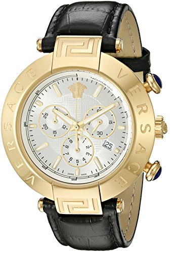 -. Binding : Watch -. Brand : Versace -. Department : mens -. EAN : 7630030509407 -. Feature : Yellow gold ion-plated watch featuring two blue cabochon pushers and silver-tone dial with applied logo, date window, and three chronograph subdials / 46 mm stainless steel case with mineral dial window / Swiss quartz movement with analog display / Embossed leather band with buckle closure / Water resistant to 50 m (165 ft): In general, suitable for short periods of recreational swimming, but not diving or snorkeling. -. Label : First SBF Holding Inc. -. Manufacturer : First SBF Holding Inc. -. Model : VQZ040015 -. MPN : VQZ040015 -. PartNumber : VQZ040015 -. ProductGroup : Watch -. ProductTypeName : WATCH -. Publisher : First SBF Holding Inc. -. Studio : First SBF Holding Inc. -. Title : Versace Men's VQZ040015 Analog Display Swiss Quartz Black Watch
