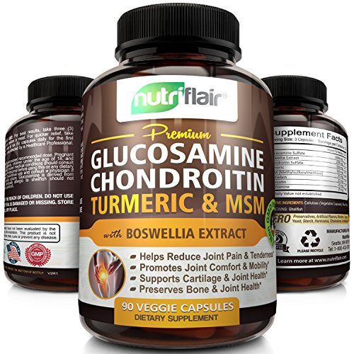 Studio : NutriFlair Publisher : NutriFlair Binding : Health and Beauty Product Description NutriFlair Premium Glucosamine / Chondroitin / MSM / Turmeric Curcumin featuring Boswellia, Bromelain, Quercetin This proprietary blend of natural ingredients has been formulated to assist with joint support and flexibility. It contains 1500 milligrams of Glucosamine which helps keep cartilage in joints healthy, supports sports injury recovery. Chondroitin reduces pain and increases joint mobility. It reduces pain, inflammation, and stiffness, and helps produce collagen. FEATURES: - Made with Natural Ingredients