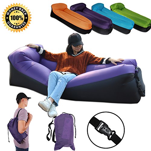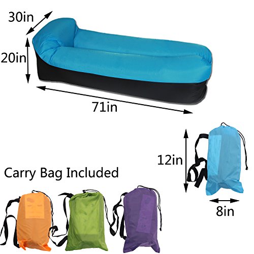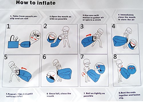 Specification - Material: polyester - Bearing Capacity:420 lbs - Package size: 12 x 8 x 4 inch / 31 x 20 x10 cm - Inflated size: 71 x 30 x 20 inch / 180 x 75 x 50 cm - Weight: 1.8 lb / 0.8 kg Package included 1 x Inflatable lounger sofa 1 x Portable bag NOTICE 1. Don't make circles when you inflate it again wind, the bag is too long to be easily tripped over by it. 2. Don't jump on it , keep its long lifetime. 3. Keep it away from hard and any sharp objects . HOW to inflate Our Air Sleeping Bag is Easiest in the Market To Inflate. 1 - Open the mouth of one side of the Air Chair. Swoop the Air Chair into the air while taking a a side step, run fast upwind for about 15 feet then close the pocket mouth during running. Do not stop running. Quickly close the mouth of the bag to trap the air. Repeat the front steps to inflate another one. You don't need the lounger to be packed with air. The following steps will compress the air in the bag to create its fullness. 2 - With air in the bag, start rolling the closed ends over 3-5 times until air is compressed and snug tight. 3 - Grab the corner ends of the mouth and bend until clips come together, buckle clips. 0