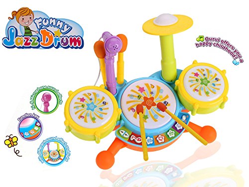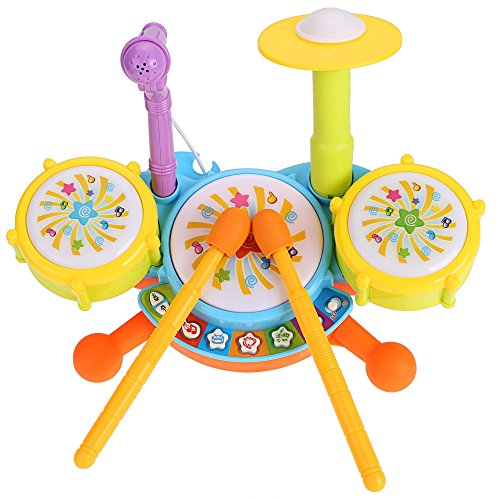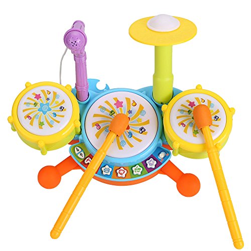 -. Feature : Kids learning toy has three drum pads and two cymbals with its own unique sound, Rhythm lights flashing, several songs, hi-fi microphone sound effects,great music learning toy for your baby. / Help baby learn music when they playing,It's a great gift for your kids. This drum set can enhance baby's interest of learning and improve the Auditory sense. / Adjust the microphone up and down, or take the microphone off, play drums and sing with music, beautiful songs, vivid sounds, high-sensitive drums, tap the drum pads with the drumsticks or just hands, allow your child to feel like a real drummer. / Kids drums are intended for toddlers aged 0 to 5 years old; 3 AA batteries are included for demo, use new batteries for regular use. / Note: Within electronic component, the toy cannot be put in water or use in wet conditions.