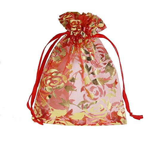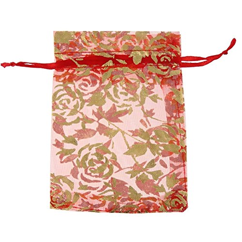 KUPOO Pack of 50PCS 3.5X4.75 Inch Drawstring Organza Bag Jewelry Favor Pouch with Gold Rose Print for Gift,Wedding,Party,Festival (red)