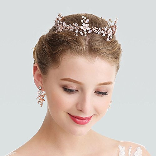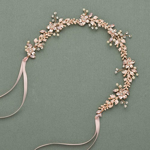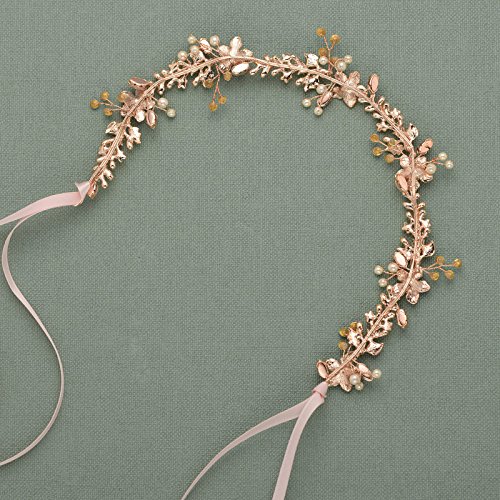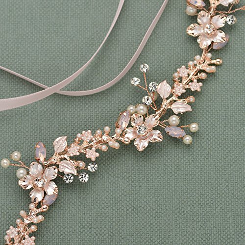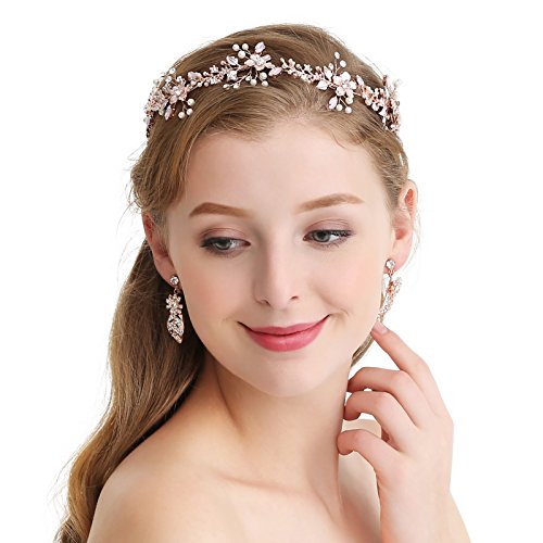 SWEETV Rose Gold Bridal Headband Tiara Wedding Vine Flower Halo Handmade Pearl Women Hair Accessories