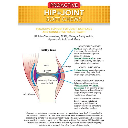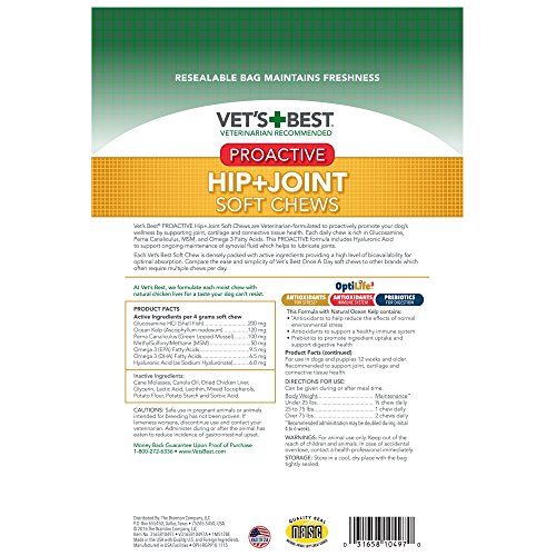 -. Feature : Vet's Best Proactive Hip + Joint Soft Chews (30ct) for dogs proactively supports joint lubrication, connective tissue and cartilage, and discomfort / Hip and Joint Soft Chews are formulated with Glucosamine, Hyaluronic Acid, Green-Lipped Mussel, MSM, and Omega 3 Fatty Acids in a Once-A-Day soft chew / Made with OptiLife3* formula, a natural Ocean Kelp, provides Antioxidants and Prebotics to help support a healthy immune system and digestive health / Veterinarian-formulated and recommended - Proactive Hip + Joint soft chews have a high level of bioavailability for optimal absorption and uptake / One (1) package contains 30 soft chew supplements - a 30 day supply for dogs and puppies (over 12 weeks old) up to 75 lbs