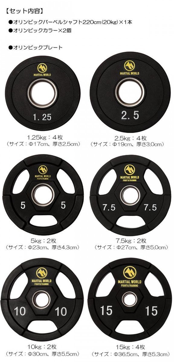 | セット内容 | オリンピックバーベルシャフト220cm(20kg)×1本、オリンピックプレート(1.25kg:4枚、2.5kg:4枚、5kg:2枚、7.5kg:2枚、10kg:2枚、15kg:4枚)、オリンピックカラー×2個 |