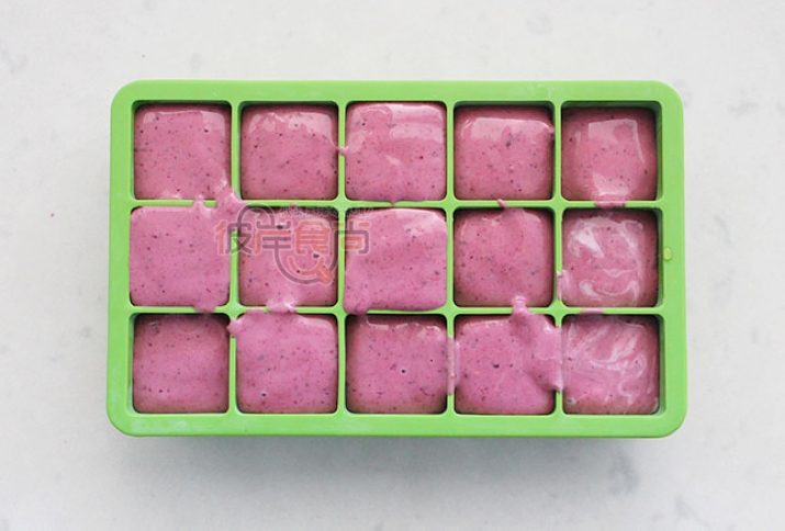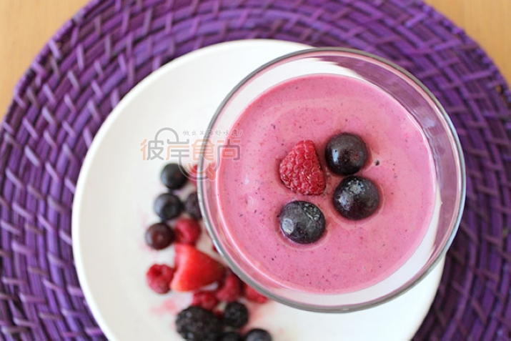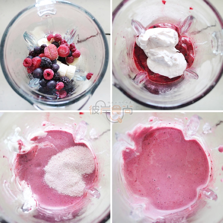 蓝莓、覆盆子、草莓、香蕉、白糖与酸奶一起打烂成泥。
