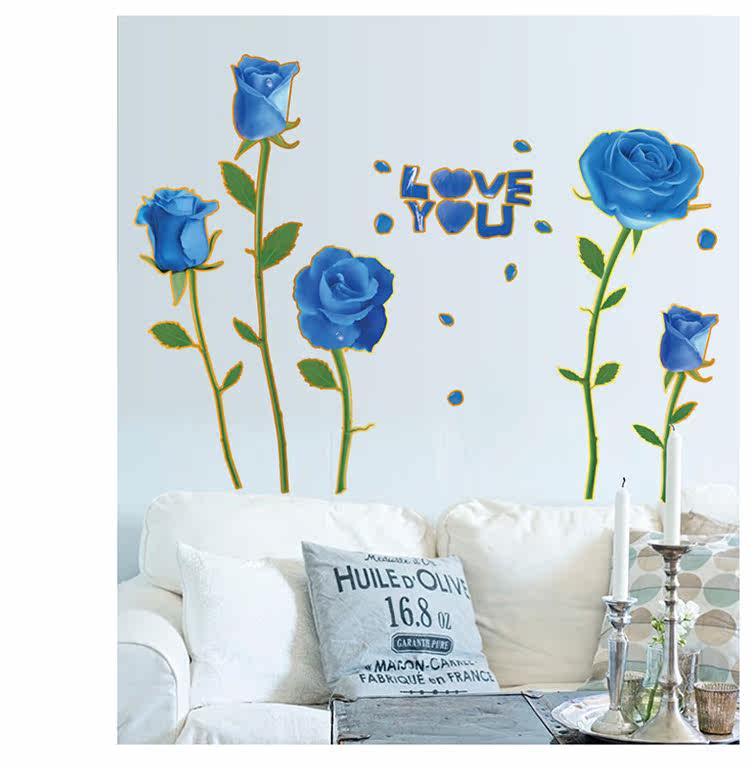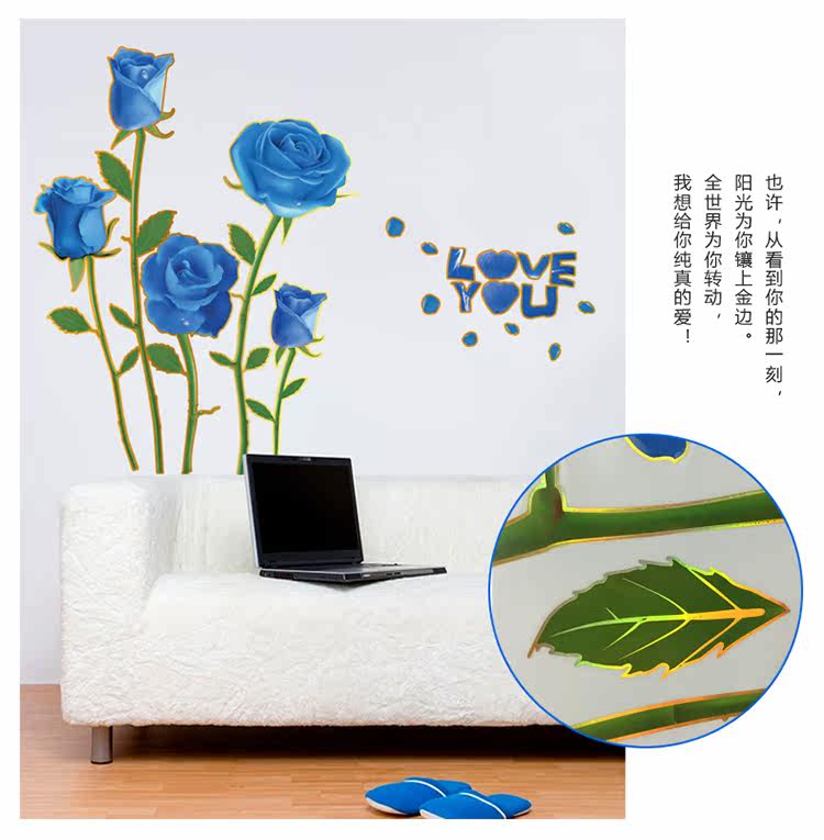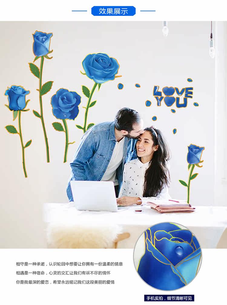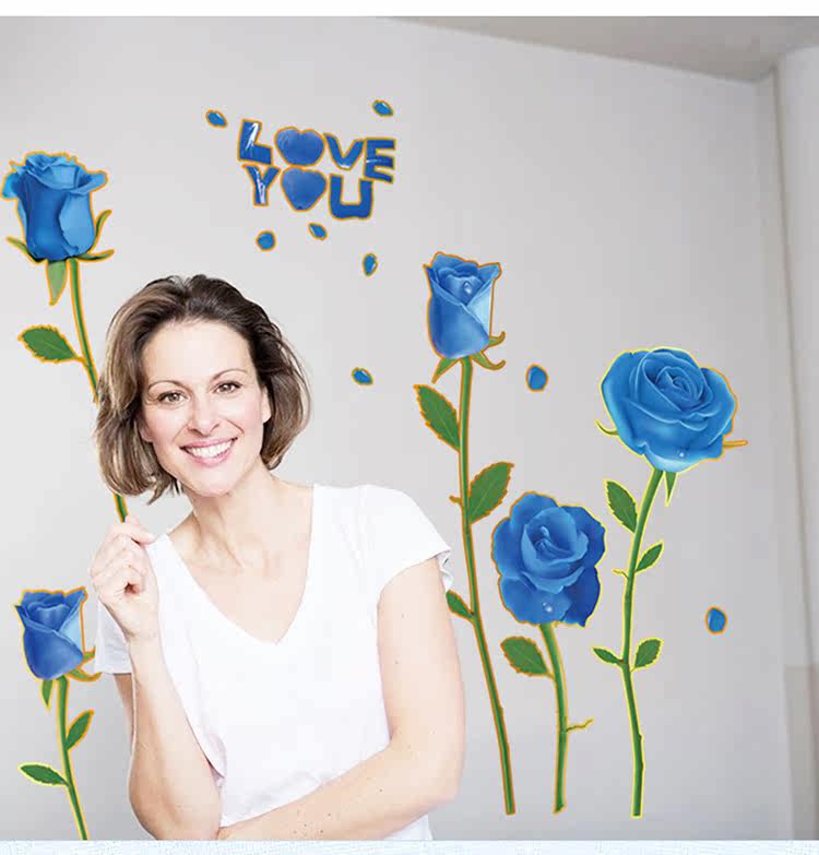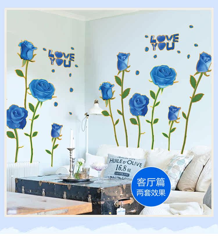 可移除浪漫装饰贴金边蓝玫瑰客厅卧室婚房电视沙发背景墙贴纸幸福