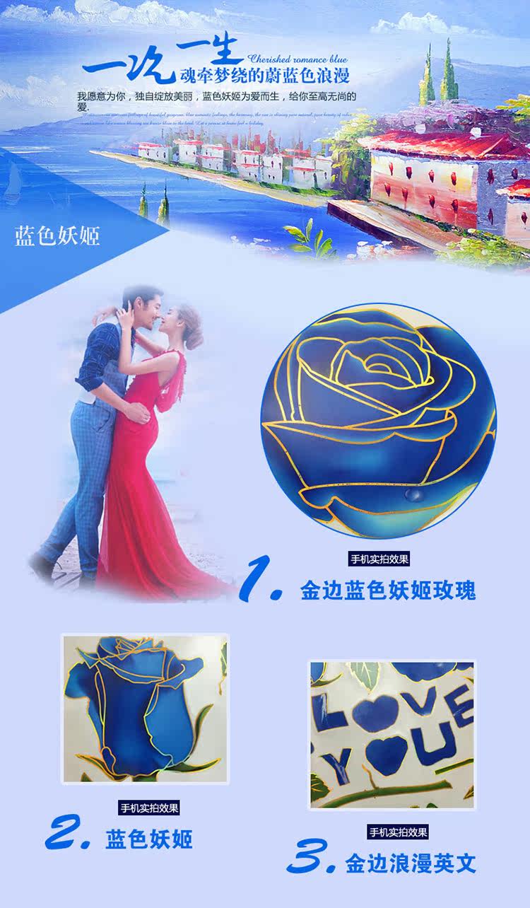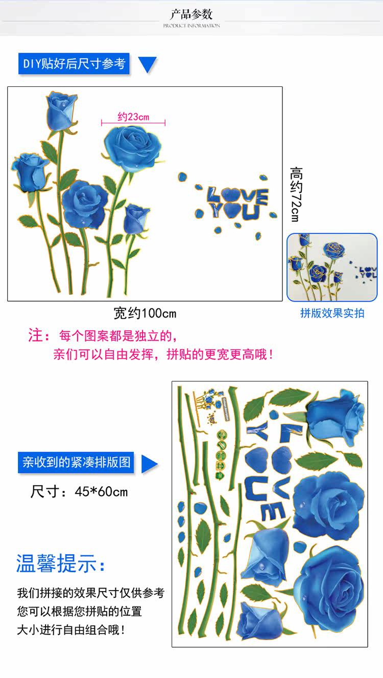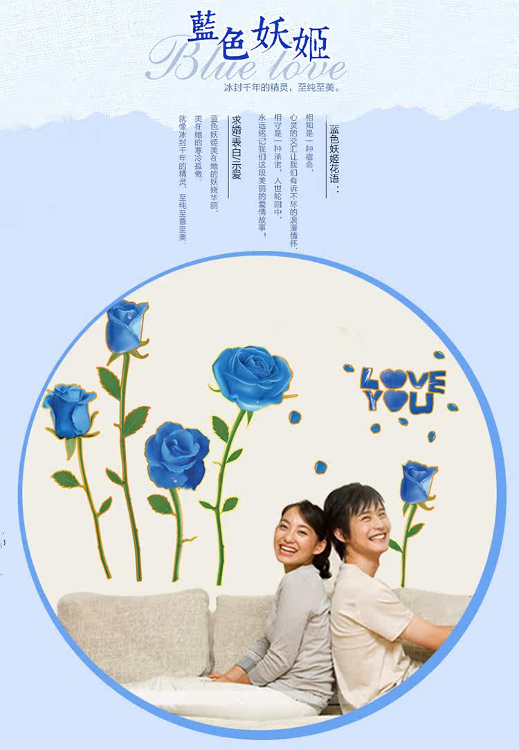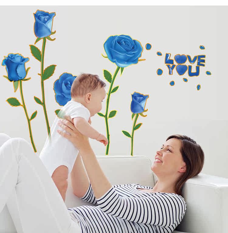 可移除浪漫装饰贴金边蓝玫瑰客厅卧室婚房电视沙发背景墙贴纸幸福