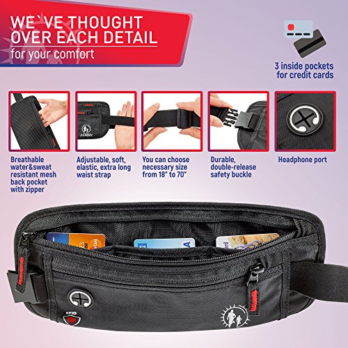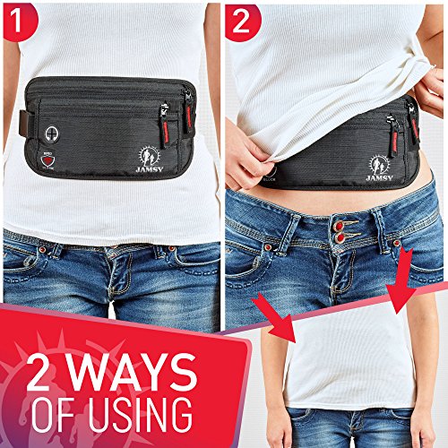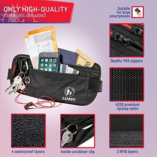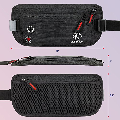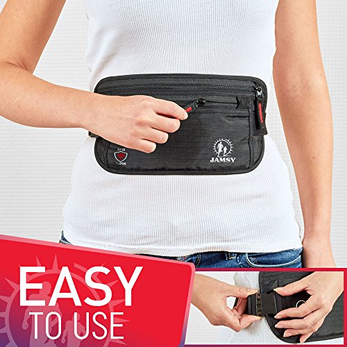 -. Title : Travel Money Belt with RFID Blocking – Hidden Waist Pack for men and women - Keep in safe your passport, cash, credit cards & smartphone with Jamsy anti-theft waist wallet
