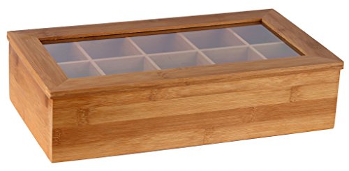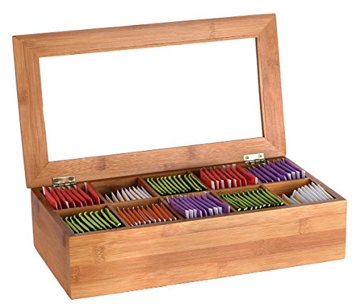 Studio : Estilo Publisher : Estilo Binding : Kitchen Product Description 10 equally divided compartments. Smooth Bamboo body and framed lid with acrylic glass for easy viewing.Made to store a variety of tea bags, sugar bags, sugar cubes, toothpicks etc. Hinged lid.Dimensions: Length - 14.5 inches, Width - 8 inches, Height - 3.5 inches. 0
