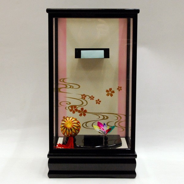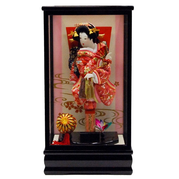 落ち着きある黒塗ケースに、上品な塗り板の羽子板飾り。やさしいお子様にと願いを込め、やさしい色使いの豪華振袖飾りに仕上げました。ツゲのかんざしを使った本格羽子板飾り。