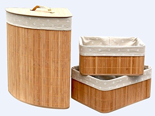 -. Binding : Office Product -. Brand : FixtureDisplays -. Feature : Organize and store often-used toiletries in style with this classic, functional set of storage hampers. Use this hamper and storage set to hold your laundry and more. This beautiful retail dump bin bamboo laundry hamper set is designed to fit neatly anywhere in your home. Made to get your laundry to the machine easily and conveniently, this hamper would be the perfect addition. / Its handy lid keeps your dirty laundry out of view. Hamper's liner makes it easy to empty on wash day. A light weight yet sturdy bamboo construction allows for easy transportation. The natural beauty of bamboo is sure to enhance any d??cor. / Comes with 1 large corner hamper with lid, 1 medium square hamper, 1 small square hamper. Large Hamper: 13.8"L x 13.8"W x 19.7"H. Medium Hamper: 13"L x 9"W x 5.5"H. Small Hamper: 15"L x 11"W x 6.3"H. Set of 3pcs Corner Folding Bamboo Laundry Basket & Trays. Brand: Fixture Displays. / Shipping to Canada and Mexico: import duty and fees apply. -. Label : FixtureDisplays -. Manufacturer : FixtureDisplays -. MPN : 100206 -. PackageQuantity : 1 -. PartNumber : 100206 -. ProductGroup : Home -. ProductTypeName : OFFICE_PRODUCTS -. Publisher : FixtureDisplays -. Studio : FixtureDisplays -. Title : Set of 3 Laundry Hampers Bamboo Corner Wicker Clothes Bin Baskets Storage Bin Organizers Retail Dump Bin 100206