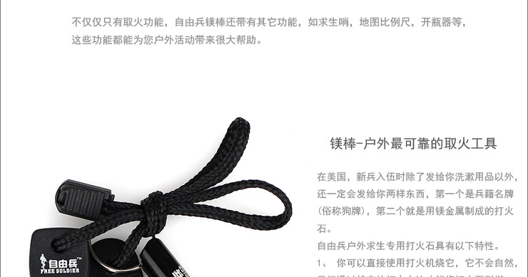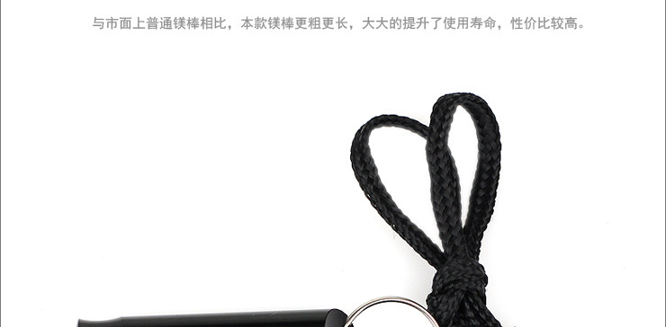 Suitable for outdoor camping use, the use of magnesium alloy ignition material (special treatment, good stability), sheet metal side of the force of friction can be instantly sent sparks high temperature and high brightness, 23,000 times ignition, high reliability, almost adapt to any climatic and environmental conditions By using, for camping, barbecue, heating convenience. Other products tend to be influenced by the harsh environment. Such as the pressure, the oxygen content of the atmosphere, water, wind, and other factors.