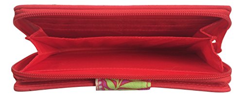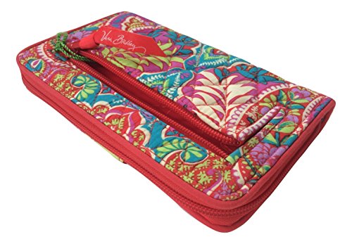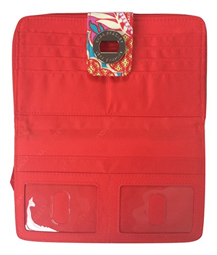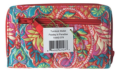 Vera Bradley's spacious Turnlock Wallet is made of soft quilted fabric on the outside with a coordinating solid custom print logo fabric on the interiors. There are two main compartments - a zip around portion features 6 card slots and two full length bill compartments. The tab and turn lock closure portion features another 6 card slots, 2 clear ID slots and a full length bill compartment. The back exterior features a zippered pocket. It measures approximately 7 3/4 inches (L) x 4 3/4 inches (H) x 1 inch (W). The location of pattern varies with each wallet. Spot clean with a damp cloth and mild soap. Patterns with solid color interiors are designed and manufactured for Vera Bradley Outlets.Feature