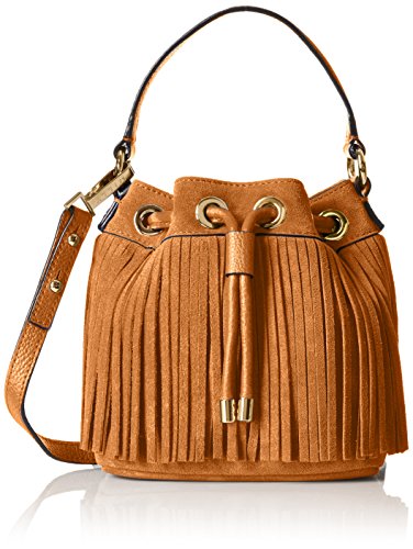 Mini-size bucket bag in allover fringe featuring drawstring closure with large gold-tone grommets and hardware