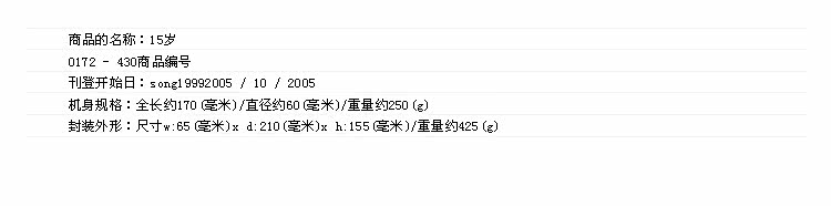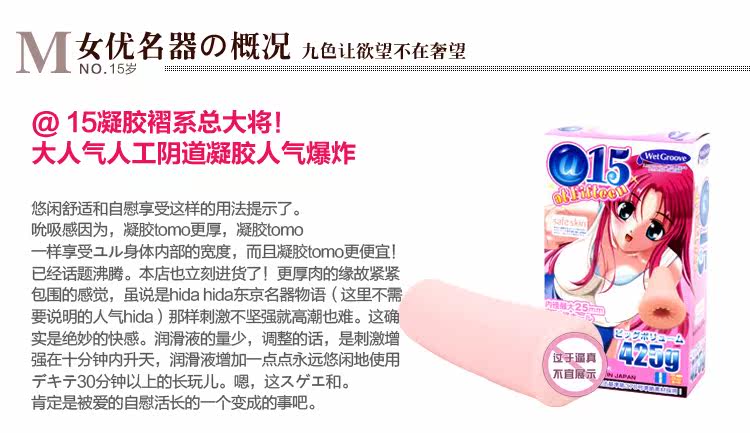店主点评:与ToysHeart另一热卖系列姐姐/妹妹相同,@15岁和R20是一个系列的两款产品,外形部分基本相同,内部结构为买家提供两种选择。厚实的分量和高强度的包裹感使得R20在台湾地区相当的知名,这款@15岁就是R20之后推出的同系列新品,内部纹理采用密集式的螺纹设计,全面逐层的刺激,配合425g的厚重包裹,新款不可错过!
