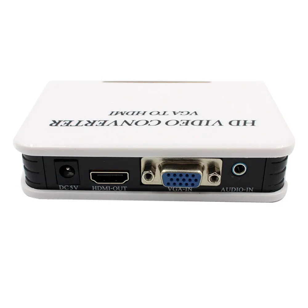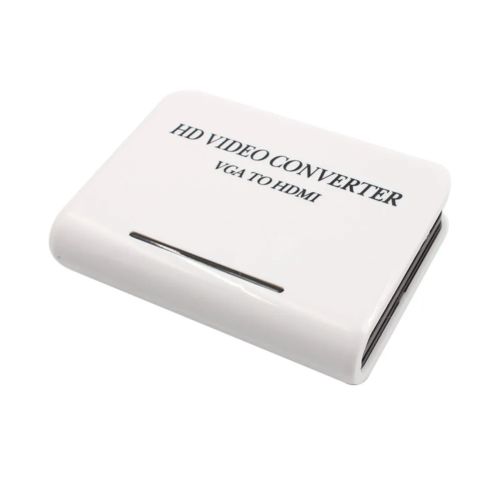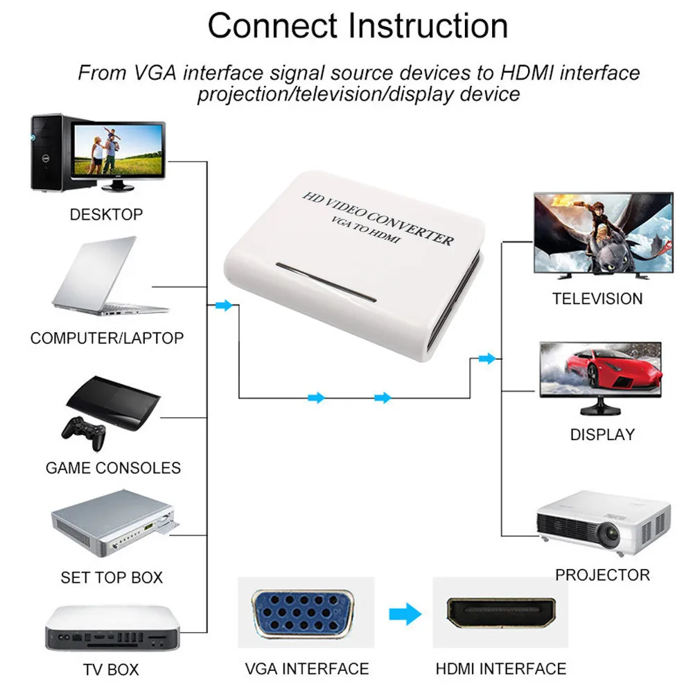 VGA to HDMI Converter box converters PC VGA and audio to HDMI, allowing connection of PC to 1080p HDTV. It supports multiple resolution up to 1920x1080.
