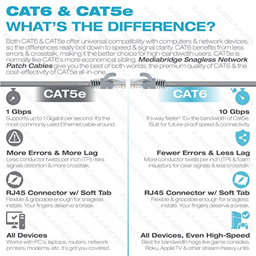 CAPABILITY: Mediabridge™ Cat 6 cables can support up to 10 Gigabits per second (10 times the bandwidth of Cat5e cables). Meets or exceeds Category 6 performance in compliance with the TIA/EIA 568B.2 standard. Backwards compatible with any existing Fast Ethernet and Gigabit Ethernet.
