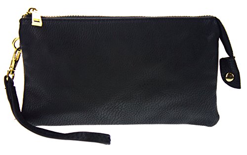 Women's Soft-Feel Leather Zipper Wristlet Crossbody Wallet (Black)