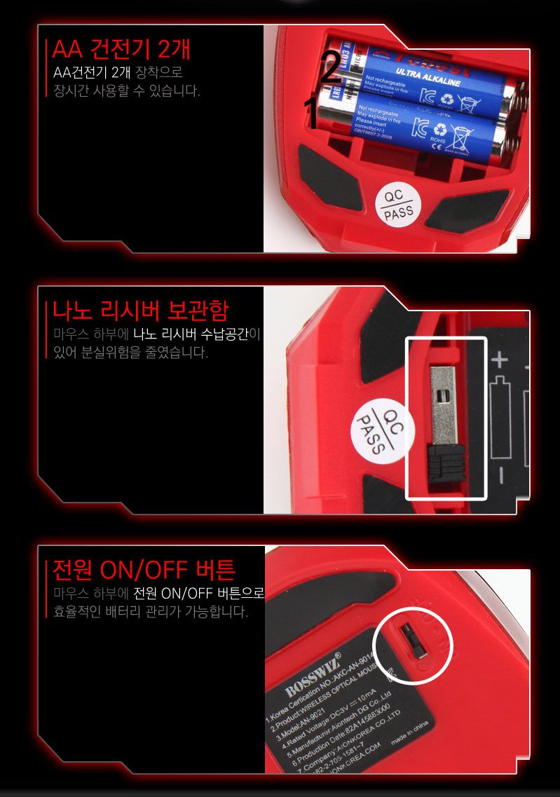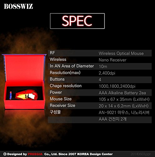 - RF- Wireless Optical Mouse / Wireless - Nano Receiver / In AN Area of Eiameter - 10M / Resolution(Max) - 2400DPI / Button - 4 / Chage Resolution - 1000, 1800, 2400 DPI / Power - AAA Alkaline Battery 2ea / Mouse Size - 105 x 67 x 35 mm (L)x(W)x(H) / Receiver Size - 20 x 14 x 6.2mm (L)x(W)x(H) / package - AN- 9021 Mice , Nano Receiver , AAA Battery 2EA