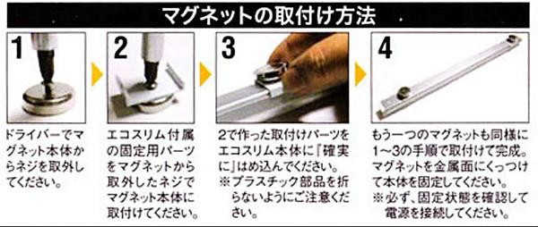 ドライバー1本で、LEDエコスリムに付属している固定パーツに簡単に取り付けて使用できます。鉄板などネジが取り付けられない場所にも取り付けられます。