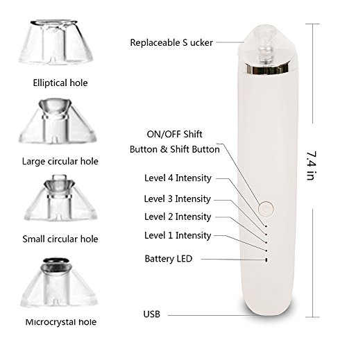 - 4 Replaceable Functional Head - Including 1 x Large circular hole head for strong suction, 1 x Small circular hole head with gentle suction for sensitive skin area, 1 x Microcrystal hole head for dead skin, 1 x Elliptical hole head for skin more elastic and compact.