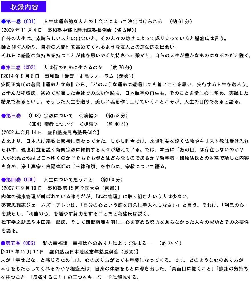 稲盛和夫氏が、各地で開催された「盛和塾」での講話と、一般市民に向けたフォーラムで語った講演をまとめた5巻組CD集。「人生をいかに生きるべきか」というテーマに沿った講演を集め、経営者のみならず、広く一般の方にも受け入れられる内容です。 |