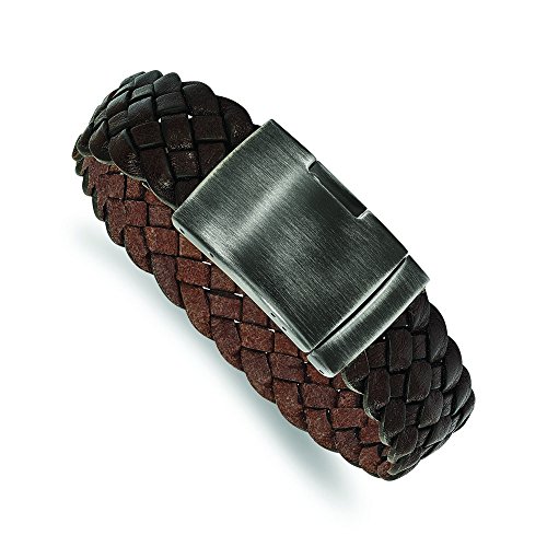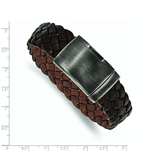 23.81mm Stainless Steel Brushed Antique Brown Braided Leather Bracelet - 9 Inch - In Solid Stainless Steel - JewelryWeb Style: QTB312706 - FREE gift-ready jewelry box