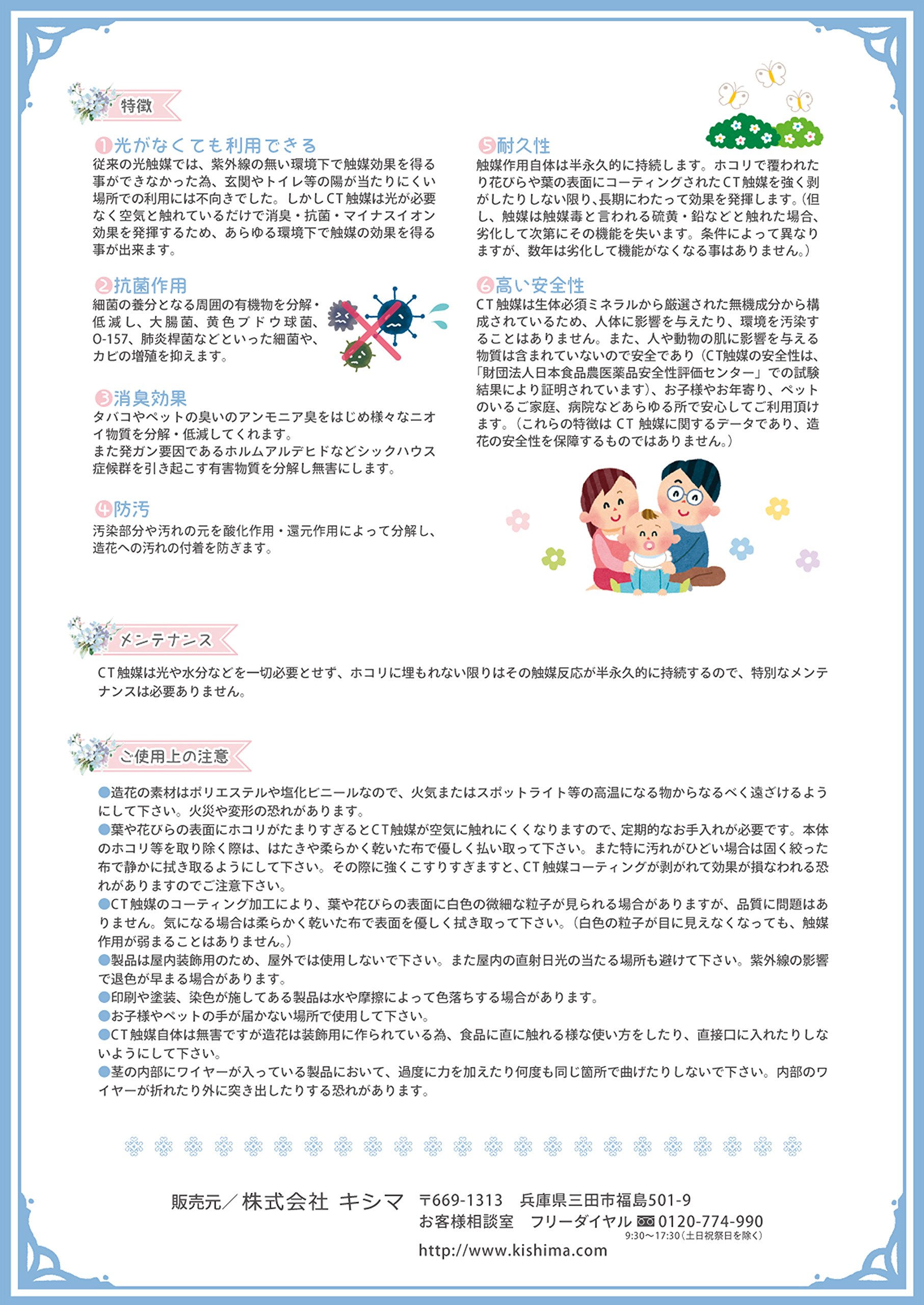 ■ CT catalyst does not require light, it exerts deodorant, antimicrobial and antifouling effects just by touching with air, so you can use it in any environment.