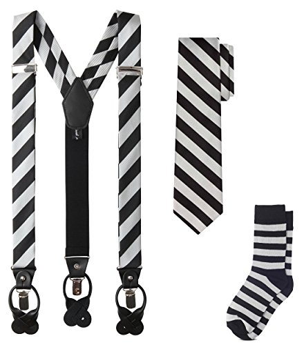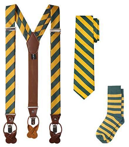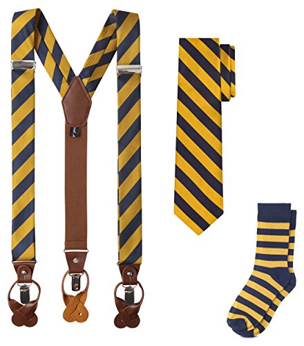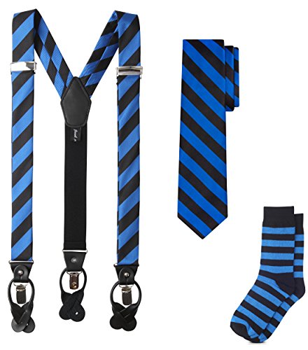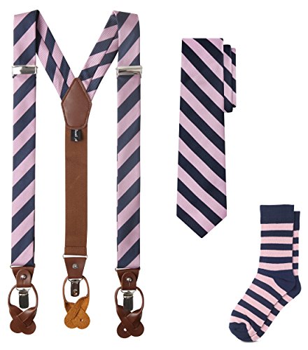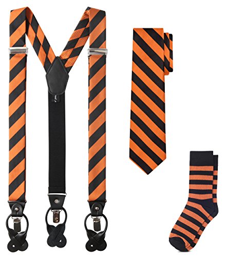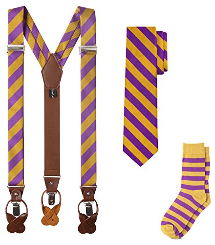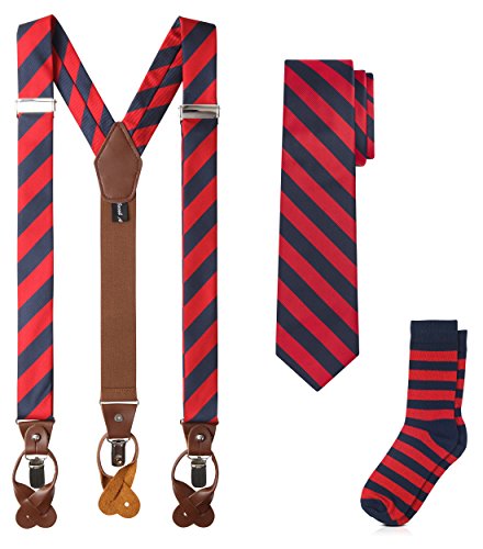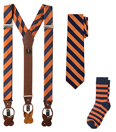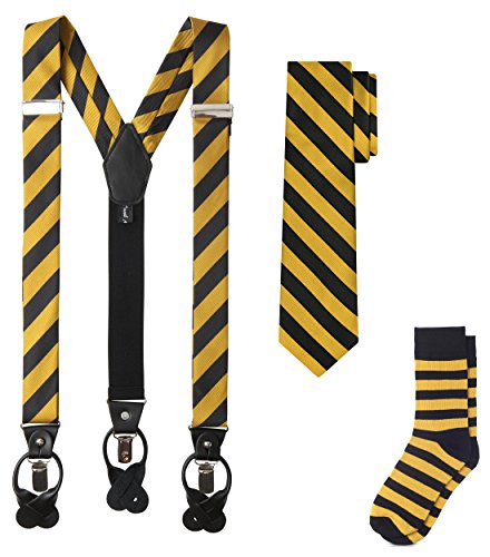 Binding : Apparel Product Description Coordinate yourself from neck to toe with our matching Jacob Alexander college stripe suspenders, dress socks, and tie combination.