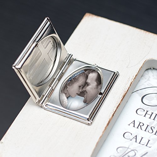 Insert personal photos in functional locket pendant. Personalize by replacing artwork with a 3 x 2 inch picture. Features scripture from Proverbs 31:28