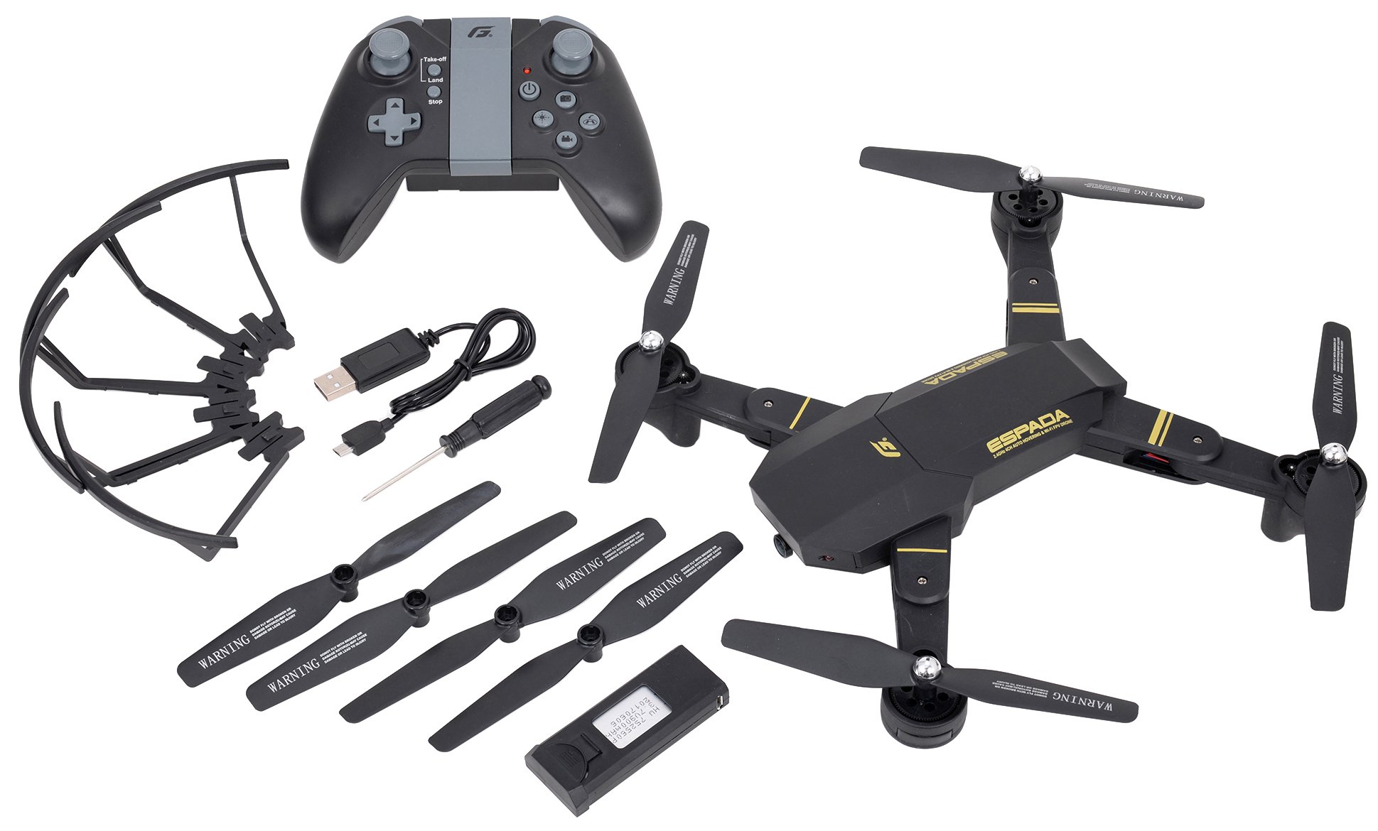ESPADA main unit, 2.4 GHz 4 ch transmitter, USB charger, spare rotor, rotor guard, instruction manual