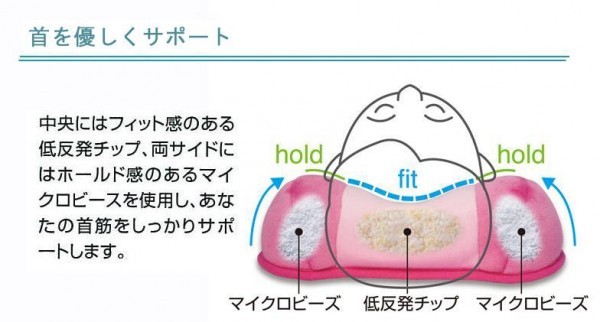 | 中央にはフィット感のある低反発チップ、両サイドにはホールド感のあるマイクロビーズを使用し、あなたの首筋をしっかりサポートします。 |