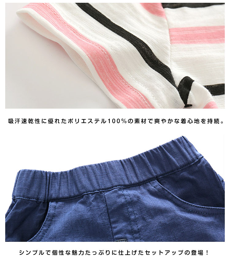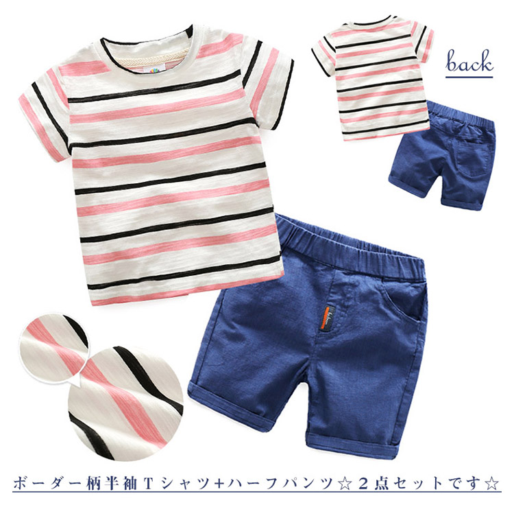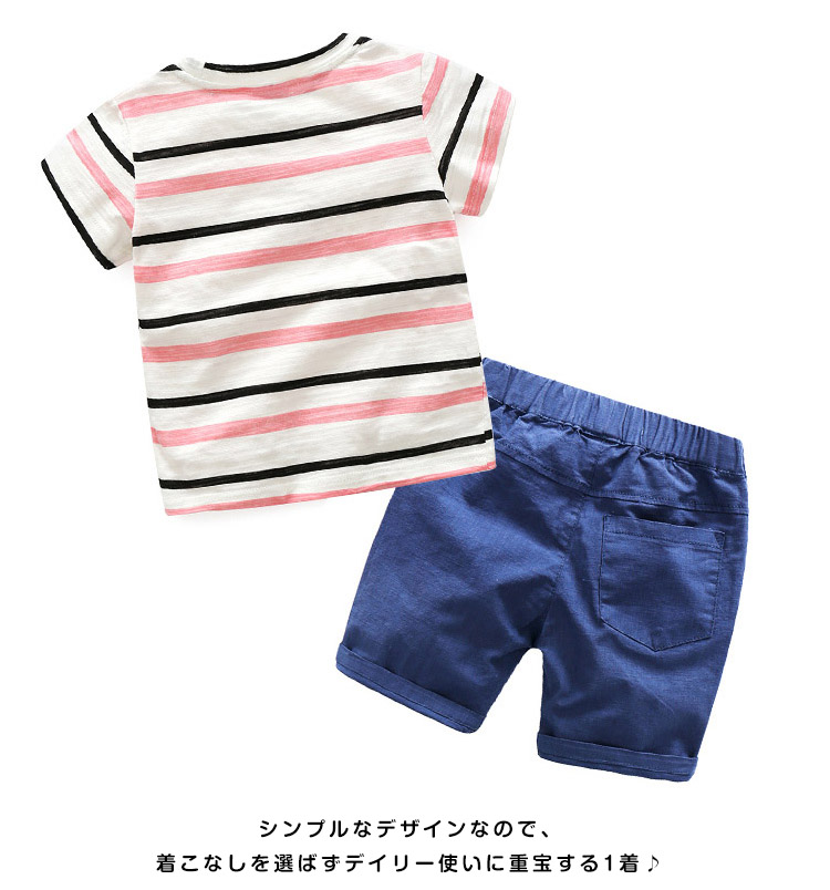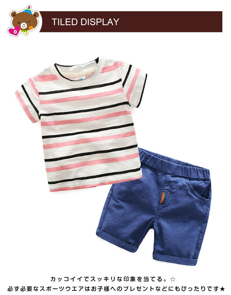 | ボーダー柄半袖Tシャツ+ハーフパンツ☆2点セットです。☆カッコイイでスッキリな印象を当てる。☆ シンプルなデザインなので、着こなしを選ばずデイリー使いに重宝する1着♪ 必ず必要なスポーツウエアはお子様へのプレゼントなどにもぴったりです★ | |