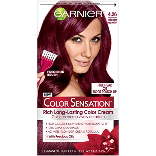 -. Binding : Health and Beauty -. Brand : Garnier -. Color : 4.26 Intense Burgundy -. EAN : 0603084458844 -. Feature : Rich, long-lasting color cream with multi-dimensional pigments for sensational color / Intense shine from root-to-tip, with precious oils / Each box includes a brush for the most precise application, and has 65 percent more conditioner than the leading value brand -. Label : Garnier Hair Color -. Manufacturer : Garnier Hair Color -. MPN : K1993200 -. NumberOfItems : 1 -. PackageQuantity : 1 -. PartNumber : K1993200 -. ProductGroup : Beauty -. ProductTypeName : BEAUTY -. Publisher : Garnier Hair Color -. ReleaseDate : 2016-10-08 -. Studio : Garnier Hair Color -. Title : Garnier Hair Color Sensation Rich Long-Lasting Color Cream, 4.26 Intense Burgundy -. UPC : 603084458844