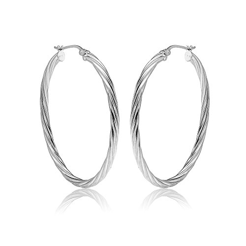 Classic and chic, these beautiful twist hoop earrings are 3mm thick with three length choices: 20mm ,25mm, 30mm. These hoops are crafted of sterling silver and are secured by post with snap-down backs.