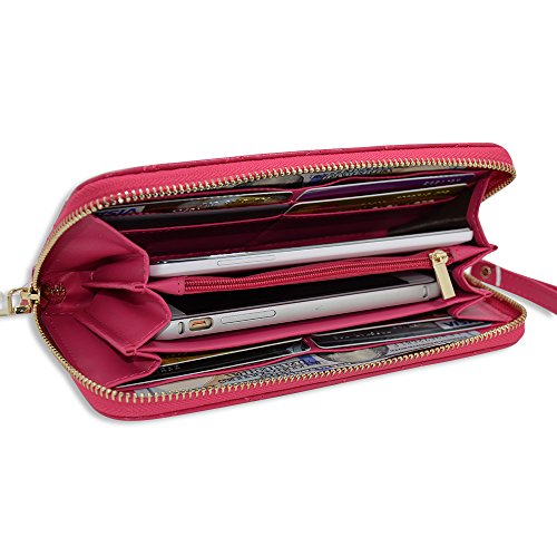 - Feature : It is made of high quality Genuine Cow leather (pls check by attached bit genuine leather sample) which is durable and pretty. It is designed by Classic Quilted material, diamond texture / Dimension: 7.8. x 4.1 x 1.0 inches (L x W x H) / Compatibility: Suitable for Apple iPhone 6 (4.7) iPhone 6 Plus (5.5), 5/5S/5C, Samsung Galaxy S6 S5 S4 S3 Note 4, 3, 2, HTC and all other cellphone, money, ID card, credit card, keys, and other small stuffs / This super convenient bag can be used as a handbag, clutch bag, purse wallet, wrist bag, Wrist strap design makes clutch into an essential and easy to carry, removable wrist strap is 6". / Great zipper bag, it is precise and multi-function designed with 3 separate pouches, 8 card slots, 2 cash/receipts slots. Best organizer for women