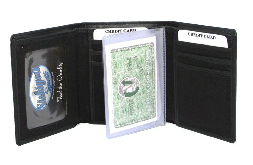 Our College collectors leather/nylon tri-fold wallet features a sculpted and handpainted team square on a black leather trifold. Includes an ID window, slots for credit cards and clear plastic photo sleeves. For a sporty feel, the liner of the wallet is made of soft quality nylon.Feature