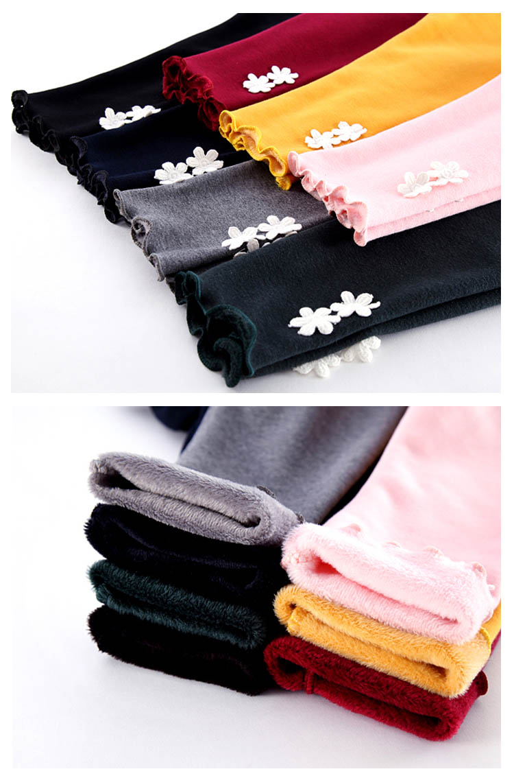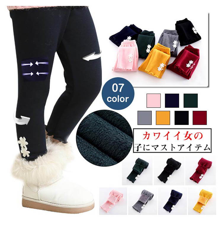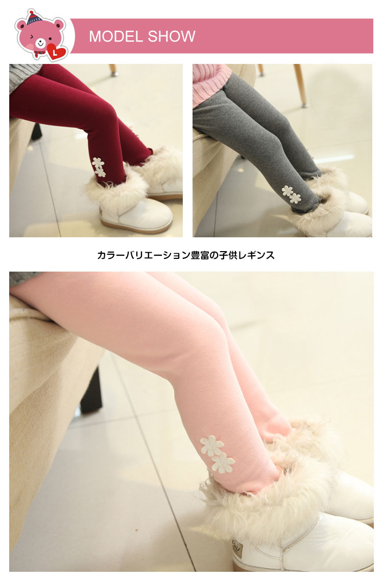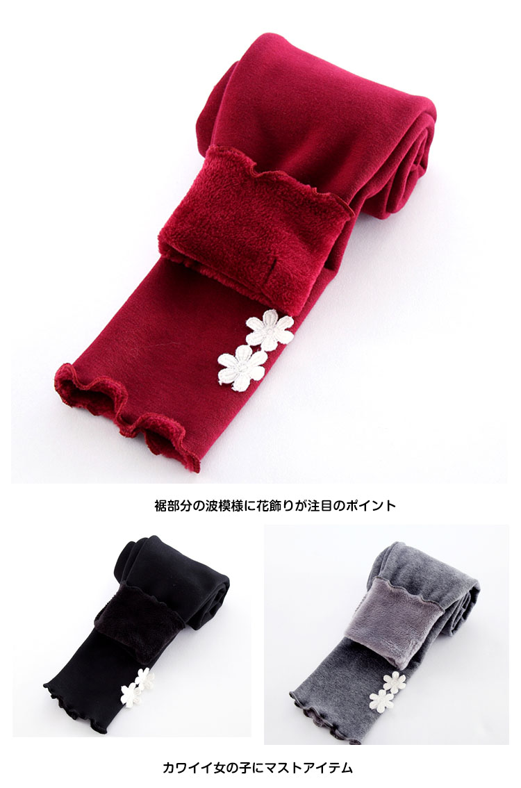 | カラーバリエーション豊富の子供レギンス色違いで揃えたくなっちゃうその可愛さ!伸縮性よくのびのびと穿きます裾部分の波模様に花飾りが注目のポイントカワイイ女の子にマストアイテム | |