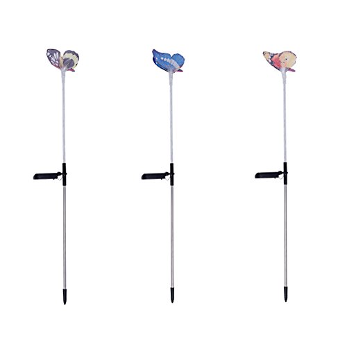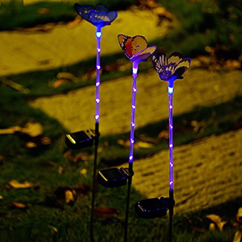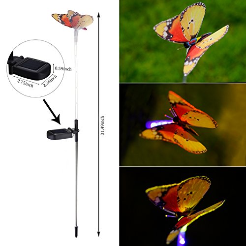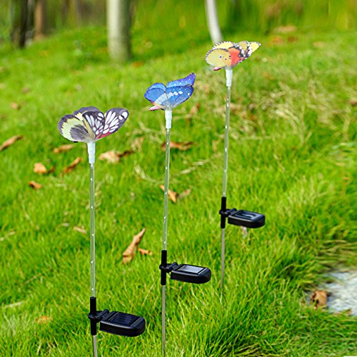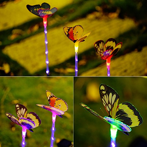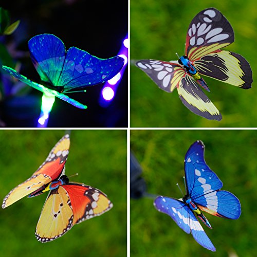 - COLORFUL VARIATIONS: Automatic flashing of colorful color loops, fiber optic material and lovely butterfly shapes make solar lights look unique.
