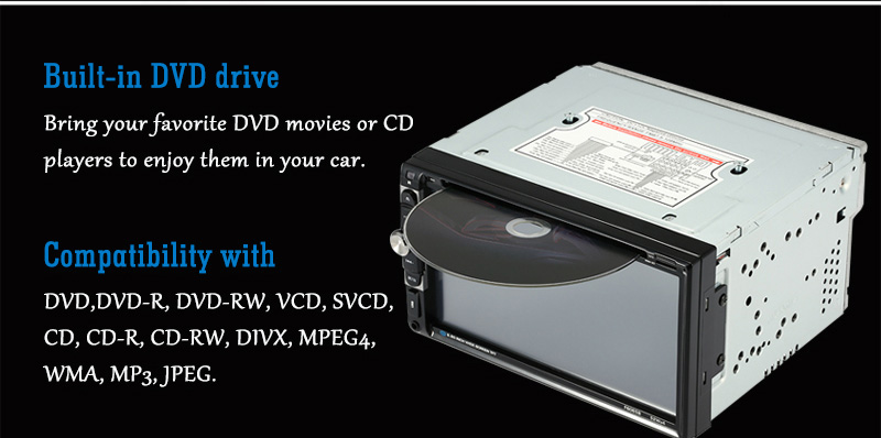 6. Compatibility with DVD,DVD-R, DVD-RW, VCD, SVCD, CD, CD-R, CD-RW, DIVX, MPEG4, WMA, MP3, JPEG.