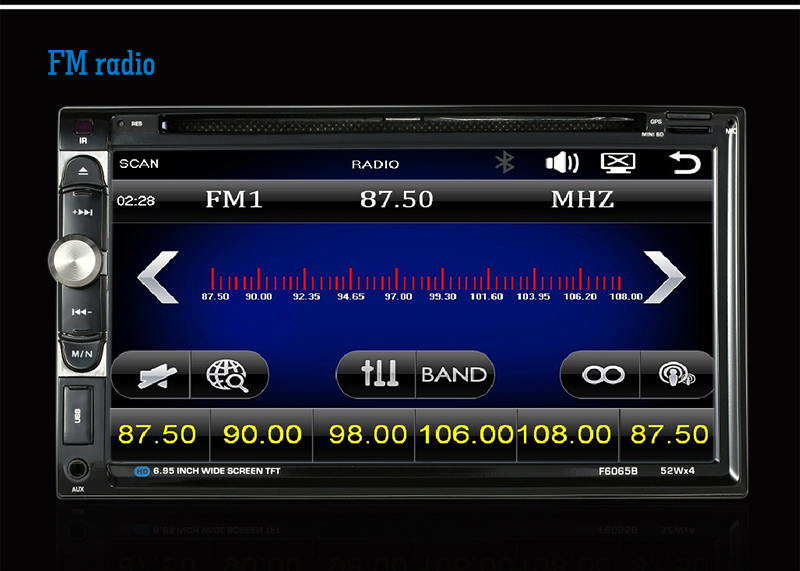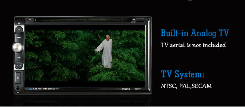 7 inch big HD touch screen + 1080P movie player + Bluetooth + DVD/FM + Analog TV + USB port /TF card slot + Aux Input + Rear view camera input + Steering wheel control