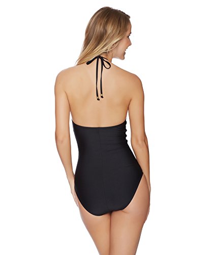 Studio : Ella Moss Women's Swimwear Publisher : Ella Moss Women's Swimwear Binding : Apparel Product Description Because our top selling designer one piece is the talk of swim season, we brought it back! the Ella Moss solid one piece offers full coverage bottom in an ultra slimming silhouette with a sexy plunging neckline featuring beautiful crochet design that adds a touch of minimalistic detail to this solid black swimsuit look. Full coverage bottom and neck ties with brass bead findings complete the look. Wear this look on the water or with high waist bottoms for a look perfect from the festival to the water. 0