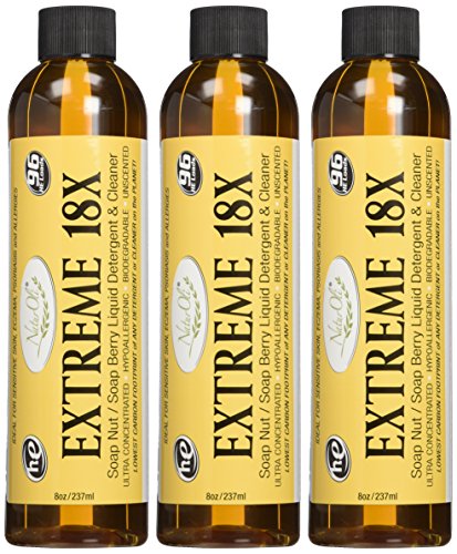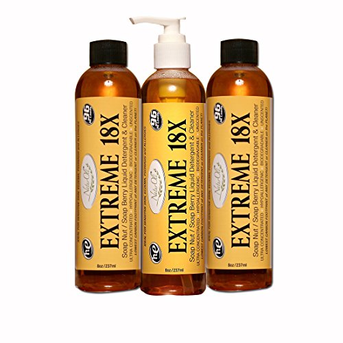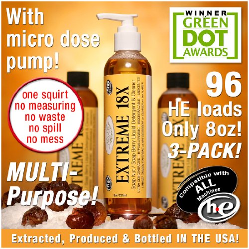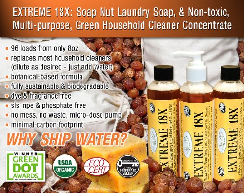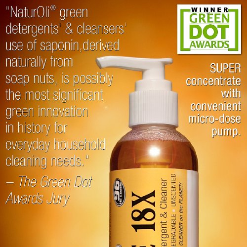 Soap Nuts (aka soap berries, soapnuts, soapberry) Natural Liquid Laundry Soap, Detergent & Multi-purpose, Household Green Cleaner - 18X SUPER-CONCENTRATE! Convenient, no-mess, no-spill, micro-dose pump. Low cost per load. Dilute as desired for household cleaning needs. Recognized by the prominent Green Dot Awards as: "NaturOli green detergents and cleansers use of saponin, which is derived naturally from soap nuts, is possibly the most significant green innovation in history for everyday household cleaning needs." and further proclaimed, "Although the Green Dot Awards are worthy unto themselves, they are also a consumer guide to excellence in environmentally-sustainable practices. A business with a Green Dot Award is a business that can be trusted by consumers with stewardship of the environment." Laundry will be clean, soft and fresh like you've never known before. IDEAL for all with SENSITIVE SKIN & NOSES, plus all those experiencing skin irritations commonly caused by commercial detergents and cleaners. Having our roots in the development of ultra-high quality natural skin care formulas, we have a unique perspective in the development of natural detergents and cleaners. EXTREME 18X is actually nourishing and healthy for your skin and hair. Great for baby clothes & cloth diapers. For HIGH EFFICIENCY (HE) & STANDARD WASHERS. Eliminates need for chemically laden fabric softeners and dryer sheets, too! As a signer of the "Safety in Cosmetics Compact", we abide by strict policies in product development. Be assured all NaturOli formulas meet or exceed the strict requirements of the "Environmental Working Groups' Safety in Cosmetics" campaign. NaturOli assures 100% TRUE full & complete disclosure of ALL ingredients. Also available at special price - 18X - 2 pack Store ASIN: B003UTF1ES.