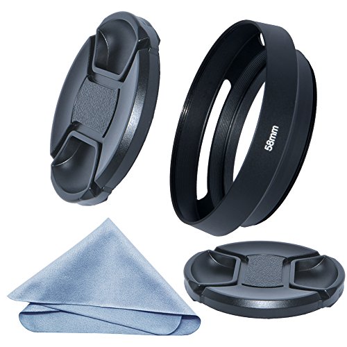 SIOTI 58mm Camera Tilted Vented Metal Lens Hood + Cleaning Cloth + 2pcs Lens Cap(58mm suit for Lens,62mm suit for Lens Hood) for Standard Thread Lens