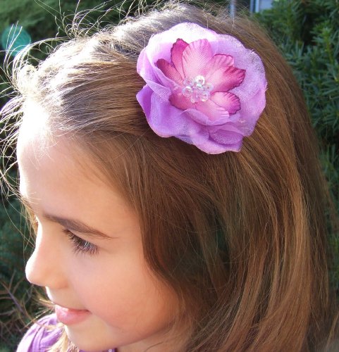 - Feature : Handmade silk flower hair clip / Hair clip measures 2.5" in width / Flower features layers of organza with a silk flower in the center / Center of flower sparkles with sequins / Available on a baby snap clip or no -slip alligator clip