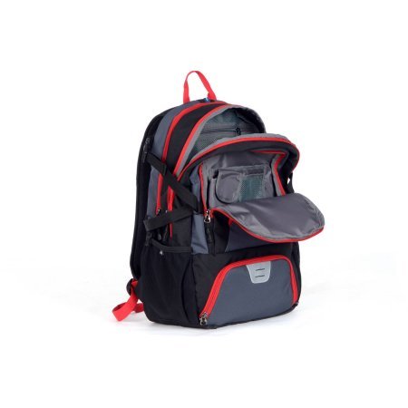 -. Binding : Electronics -. Brand : Ozark Trail WMT-HYD-E -. Color : Black -. EAN : 0714547198631 -. Feature : 35-liter capacity Heavy-duty ripstop material Thermal-insulated pocket to keep your food and drinks fresh Hydration-compatible / Multiple storage compartments for added gear storage and organization Fleece-lined sunglasses pocket 2 water bottle pockets Compression straps to help stabilize the load and minimize the pack profile / Interior storage sleeve securely holds a hydration reservoir, laptop or tablet Air-mesh padded shoulder straps and back panel for extra comfort Airflow back panel system / Adjustable sternum straps for added support Color: gray/black/orange Ozark backpack Made of 90 percent polyester, 5 percent ABS and 5 percent metal Hand wash only / Assembled Product Dimensions (L x W x H): 19.29 x 13.98 x 4.33 Inches -. Label : Ozark Trail WMT-HYD-E -. Manufacturer : Ozark Trail WMT-HYD-E -. ProductGroup : PC Accessory -. ProductTypeName : CARRYING_CASE_OR_BAG -. Publisher : Ozark Trail WMT-HYD-E -. Studio : Ozark Trail WMT-HYD-E -. Title : Ozark Trail 35L Choteau Daypack Backpack black/red -. UPC : 714547198631