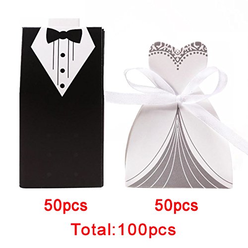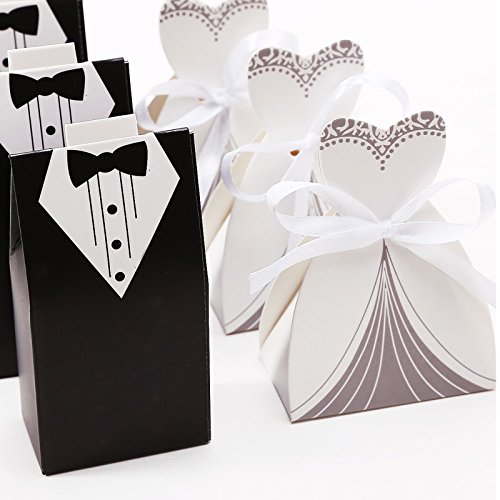 Ogrmar 100pcs Creative Party Wedding Favor Dress & Tuxedo Bride and Candy Box (white+black)