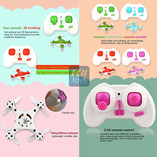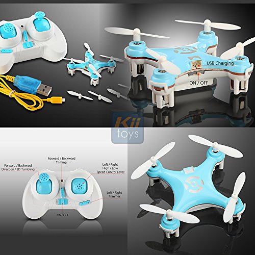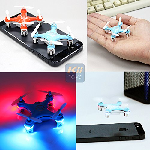 KiiToys X-10 is the Smallest Quadcopter in the world, size 1.5 x 1.5 inch (4cm x 4 cm), 5-8 mins Flight time with a single charge. 2.4Ghz Remote Control Toys 4CH 6 Axis RC Quadcopter RC Helicopters