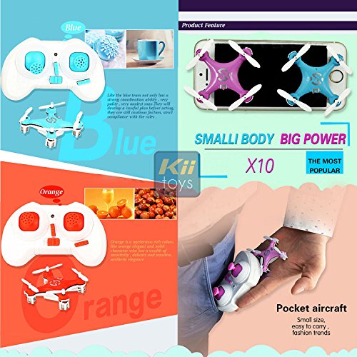 Are you looking for the perfect gift? This Remote Control Quad copter is your best choice to bring you amazing fun and excitment for all ages. KiiToys introducing the World's smallest Quadcopter X-10! The most notable feature of this quadcopter is its nano size, with only 1.5 x 1.5 inch, it is yet the smallest quadcopter in the world! Adopting solid material and exquisite workmanship, it is safe and durable enough for anyone in all age to play. It is very easy to control with the game pad style radio controller. The remote control equiped with 2.4Ghz which gives you a long range and stable control over your quadcopter with no interference. The 6 axis gyro system equiped on the quadcopter will provide you an extreme stable flight and also enable you "Throw to Fly" - to throw the quadcopter in the air to start the flight! It will bring you lots of surprise and fun in flight, and will keep you entertained all the time. Don't hesitate to bring such a good remote control toy home today. Available in 5 color: White, Green, Blue, Orange and Pink, collect all 5 colors to have a quadcopter party!
