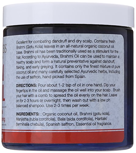 -. Binding : Misc. -. Brand : Vadik Herbs -. Feature : It lubricates and conditions the scalp, helping to prevent flakes and dry scalp without the use of harsh chemical shampoos / It helps enhance blood circulation in the head and neck area. When the scalp is "tight" from stress, circulation and hair growth are impeded. / It helps relax the scalp and increase pliability. / It helps strengthen the roots of the hair and nourishes the hair-shafts, promoting new hair growth and strengthening current hair. / It helps soften and condition the hair, making it more manageable. -. Label : Vadik Herbs -. Manufacturer : Vadik Herbs -. ProductGroup : Beauty -. ProductTypeName : BEAUTY -. Publisher : Vadik Herbs -. Studio : Vadik Herbs -. Title : Brahmi Oil - Ayurvedic Hair Growth Oil - With Saffron